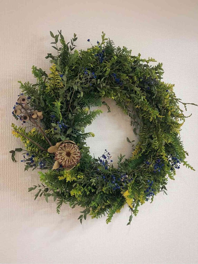 オフィス用にもうひとつリースを作りました🥰 こちらは、ヒバをメインに小さい葉っぱのユーカリや、家にあったブルーのカスミソウなどドライを合わせました🌲
