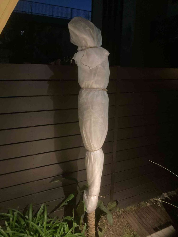 地植えのフェニックスロベレニーに冬支度でおくるみしました。