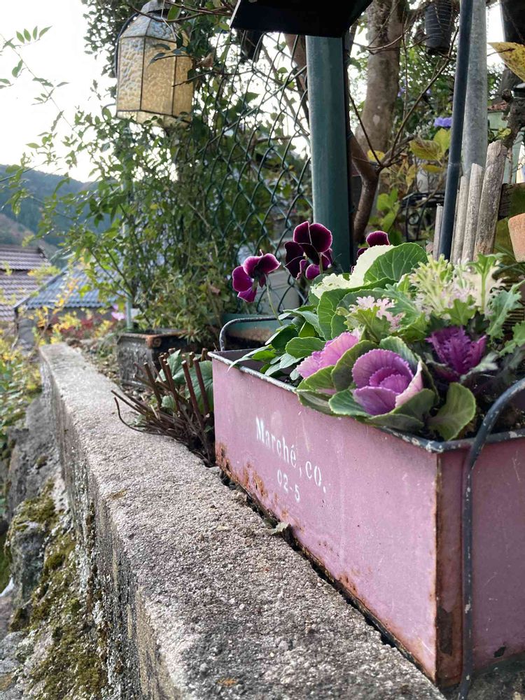 この危険な場所に何か花をと、ブリキに葉牡丹とビオラだけ寄せました🪴