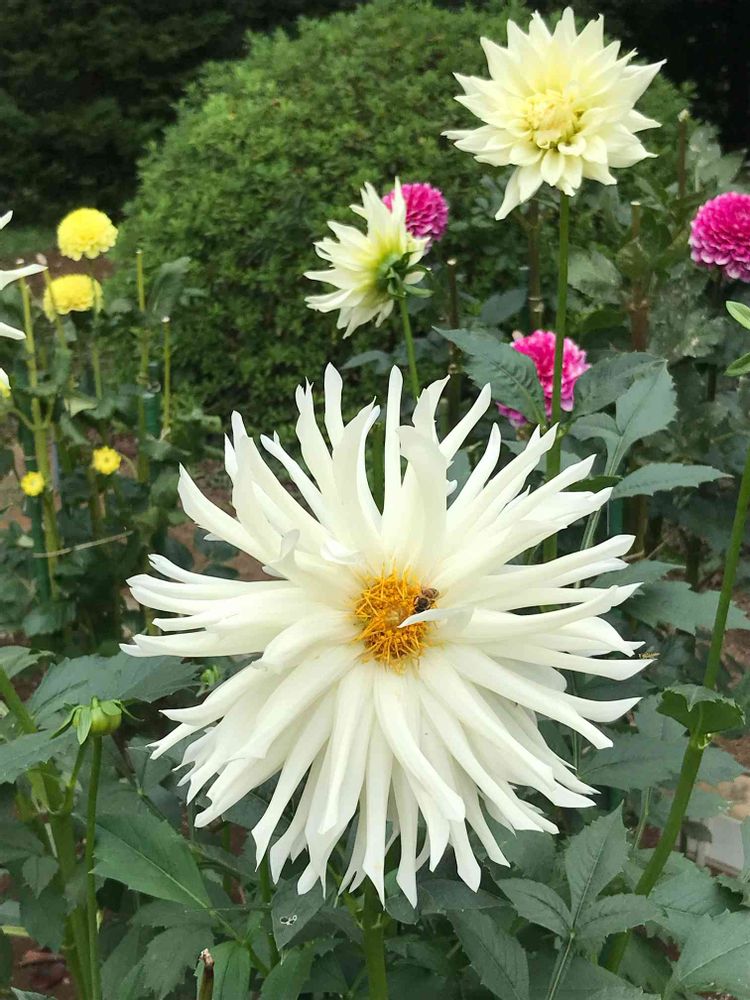 ダリアの花形は本当にいっぱいある。シングル咲き、ポール咲き、ポンポン咲き、フォーマル・デコラティブ咲き、ストレート・カクタス咲き、フリル咲き、オーキッド咲き、コラレット咲き、ピオニー咲き、アネモネ咲き、スイレン咲き、ステラー咲き等
