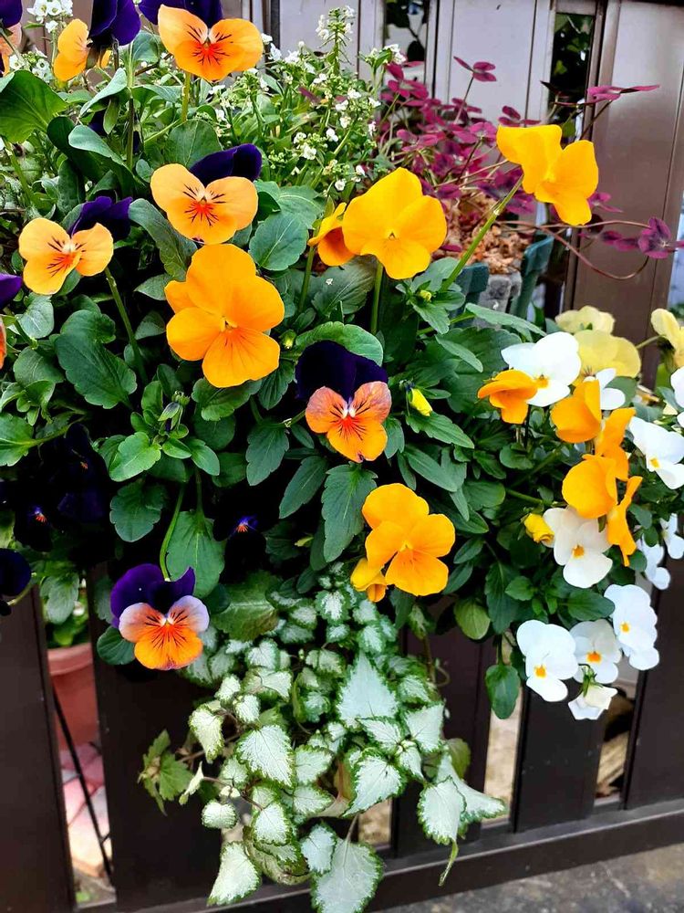 ハンギングにぎゅうぎゅうに入れ込んだビオラさん達がいい感じ💕