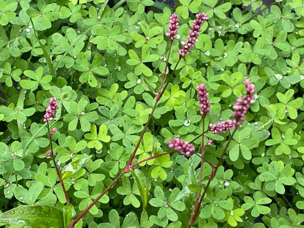 雨に濡れたオキザリスの葉を背景に、イヌタデがたくさん咲いていました💓