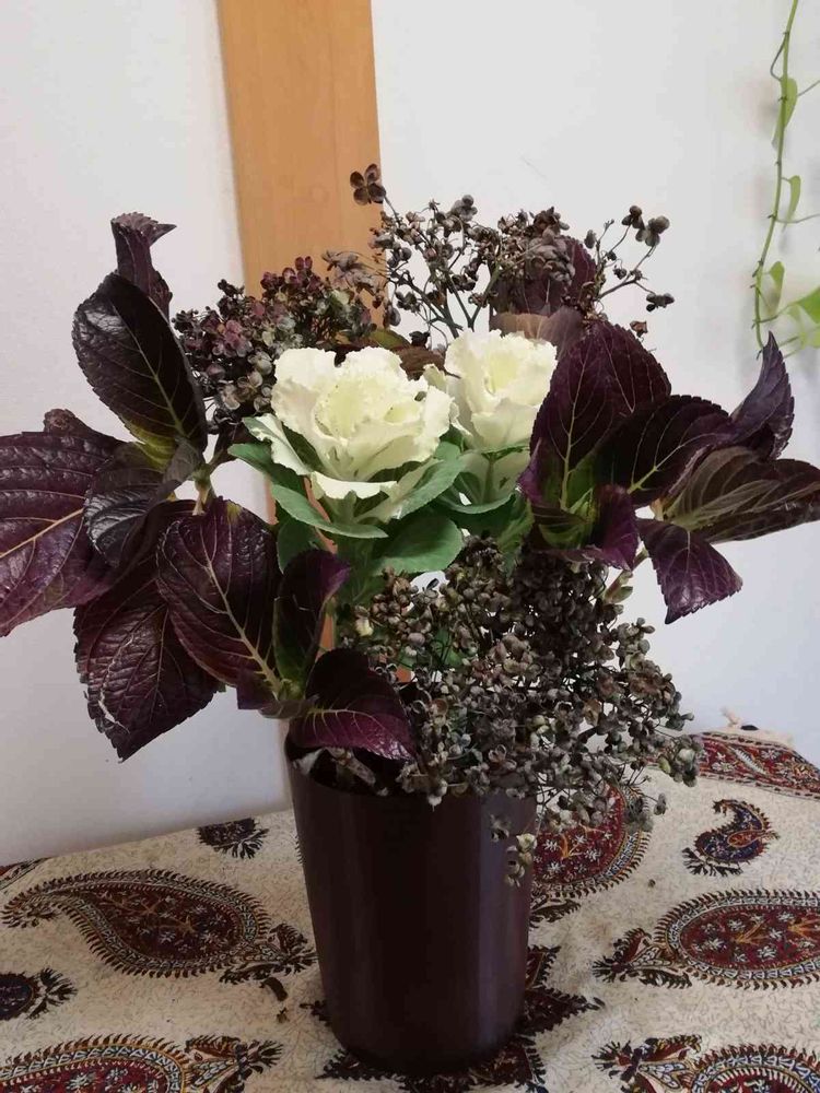 深い色合いの中で白い葉牡丹がすごく映えますね🤍下の敷布も色合いがピッタリと合ってオシャレですね✨