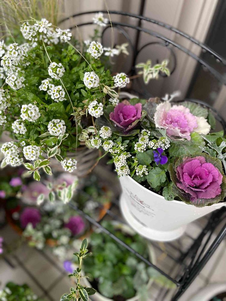 先週upした籠に寄せた葉牡丹がまだ少し残っていたので小さな鉢で寄せ植えにしました。種まきビオラの1番に開花した濃いめのパープルも添えて💜