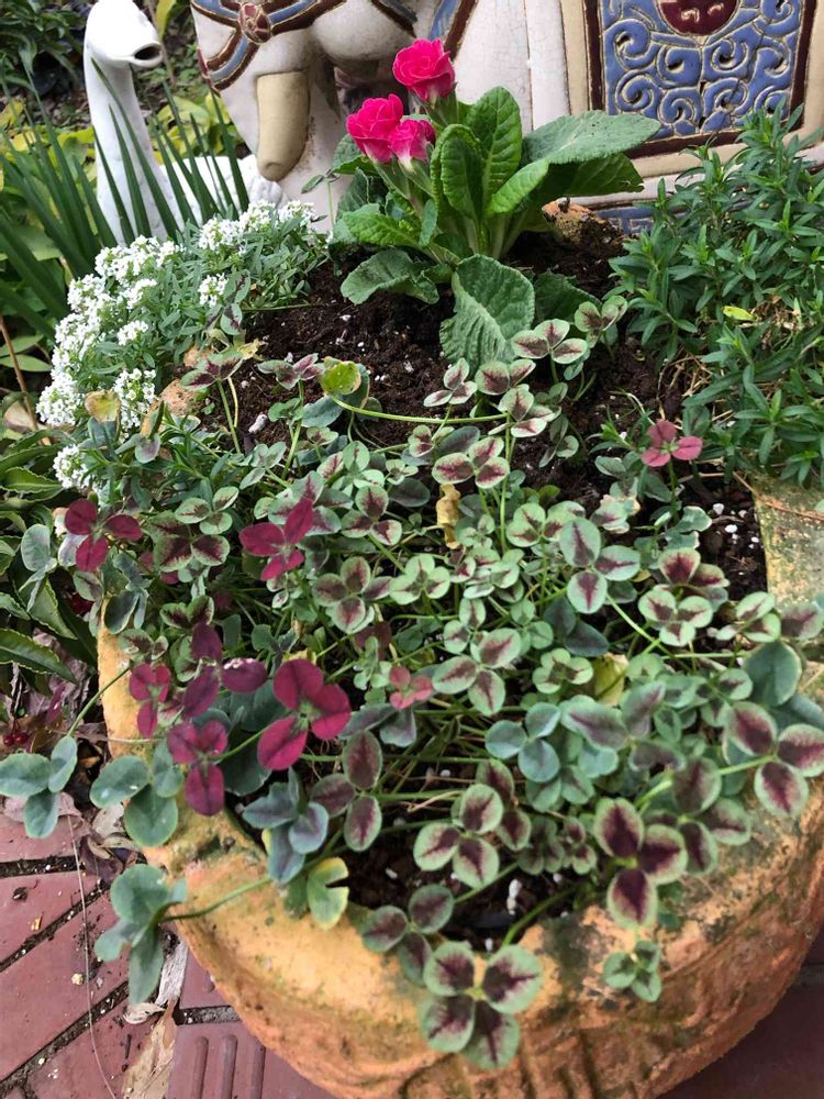 この寄せ植えは夏の花を抜き プリムラを足しただけのお手軽寄せ植えなんです。