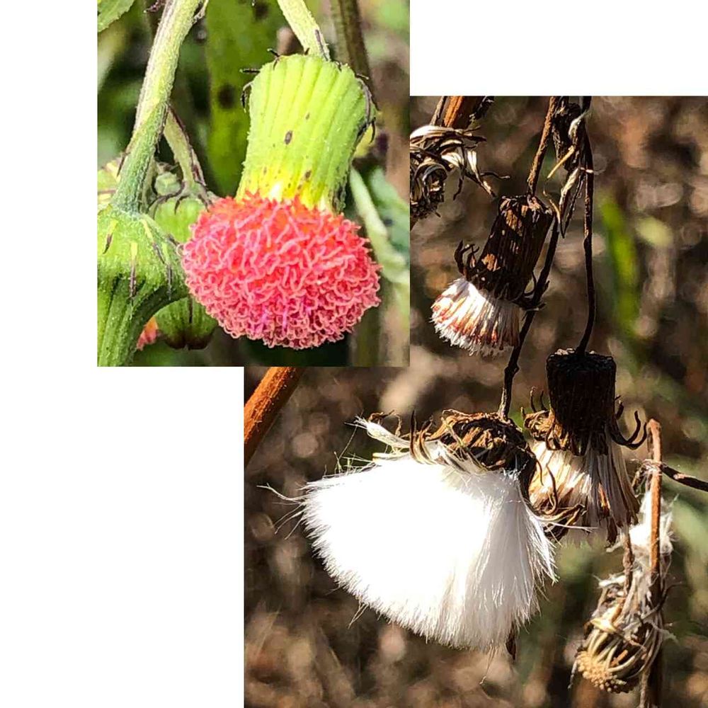 山道で目立っているのは「ベニバナボロギク」、紅色ポンポンから、真っ白なお化粧ブラシに変わっていく姿も可愛い💕