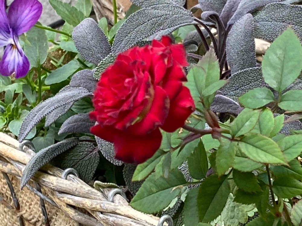 真っ赤なミニ薔薇さんとセージの銀葉が