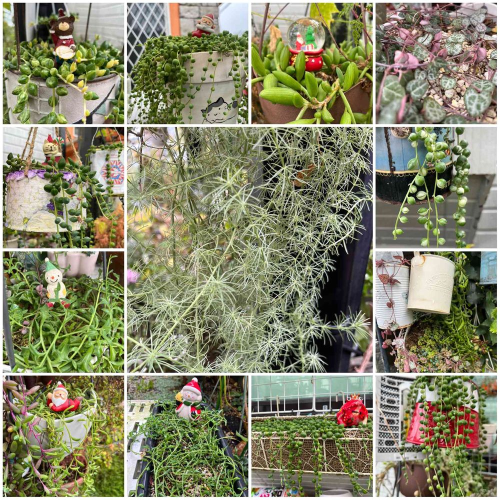 真ん中だけ多肉植物ではないのですが、長く伸びて垂れているロータス・ベルデロッティ❤️ググってみたらベルテロティになってました。名札はベルデロッティだったのですが…💦