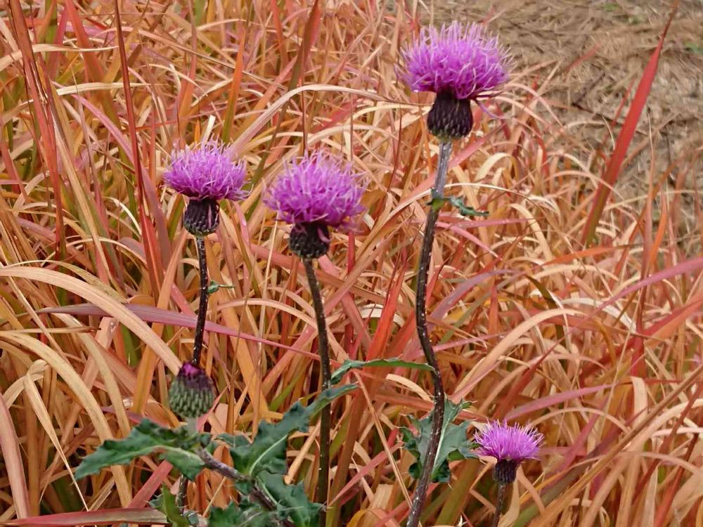 季節ならではのチガヤの紅葉、初めて見ました♪ 沖縄ではいきなり枯れてすぐにあおい芽が一緒にでてしまいます^_^ アザミがいっそう鮮やか!綺麗ですね❗️