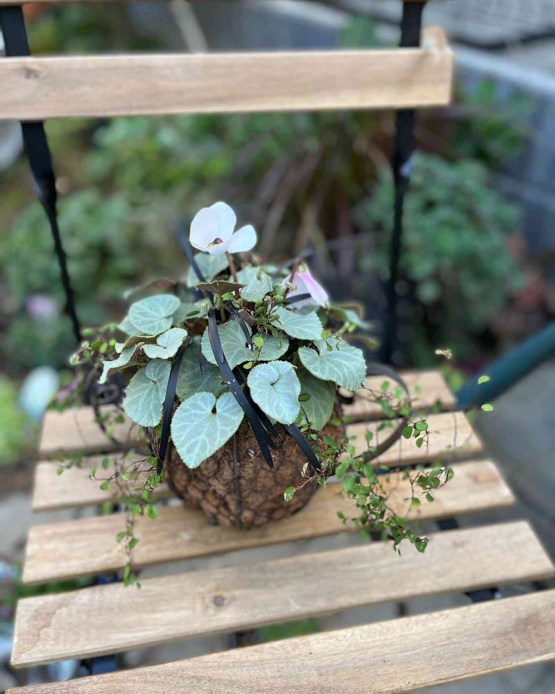 アイアンのポット型のプランターに、シルバーリーフのシクラメン アフロディーテと黒龍、ワイヤープランツスポットライトの組み合わせで、とっても素敵にお作りいただきました☺️
