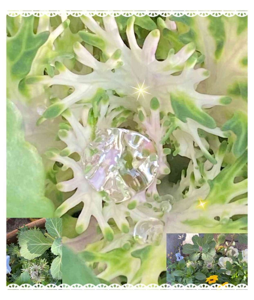 ミニ葉牡丹のフェザーホワイトの中心に溜まって輝いて綺麗でした💖