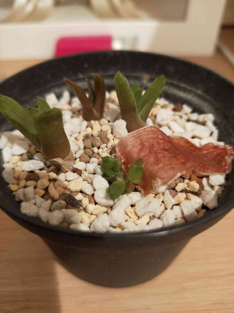 京の華、葉っぱを一枚おいてたら上手く芽がたくさん!!まだ根はなさそう……。