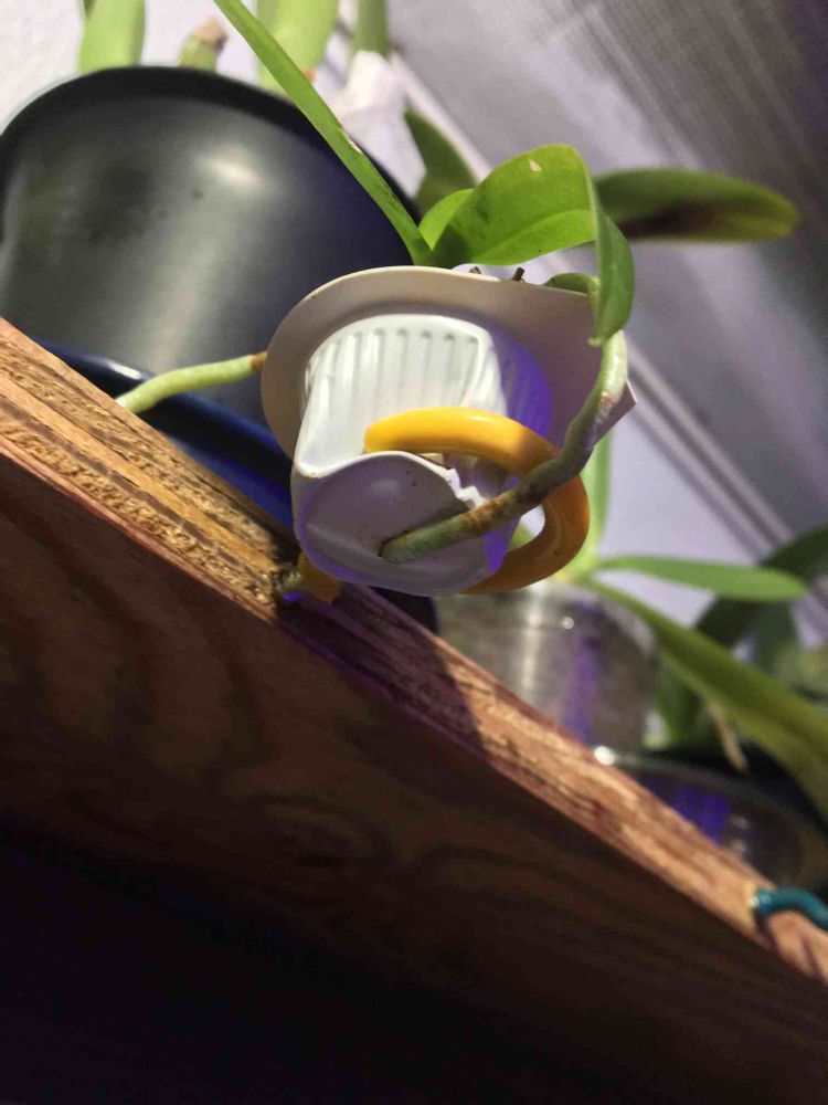 ミニ胡蝶蘭の脇芽をコーヒーフレッシュに植え替えした根がフックネジ🪝を通り越してフレッシュの底に定着してしまいました。