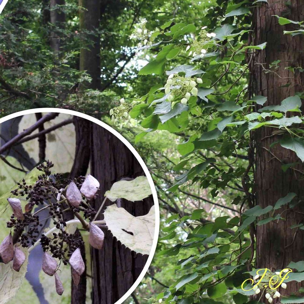 6月いつもの公園に初めてイワガラミが杉の木に蔓を絡ませながら白い花を咲かせているのを見て感激。 (谷戸山では初めての開花だそう)
