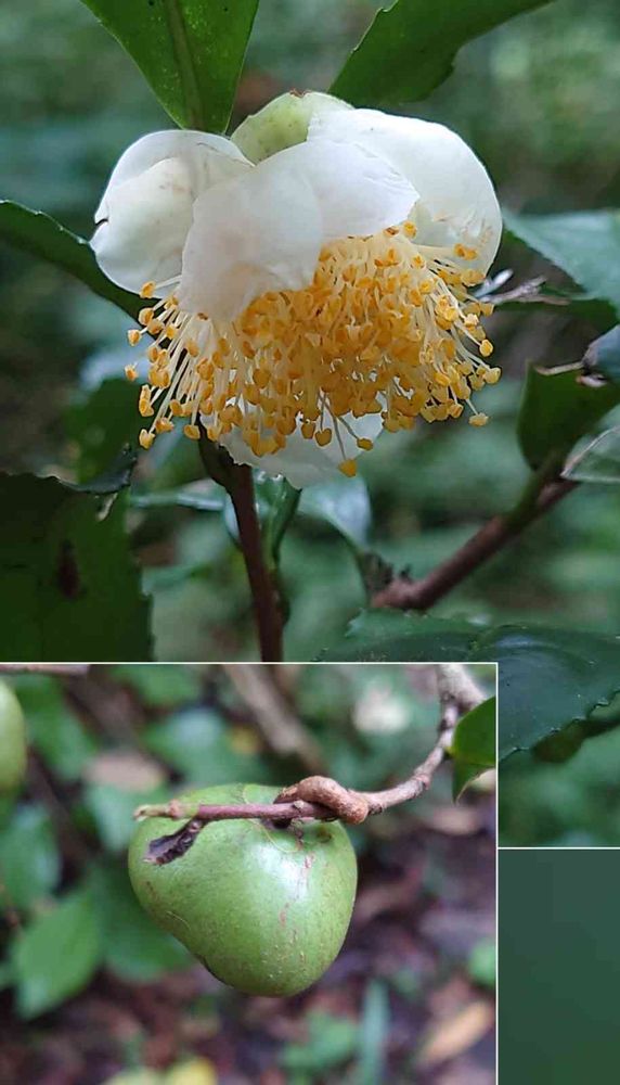 真っ白なチャノキの花と実、蕊がモフモフで素敵です✨✨