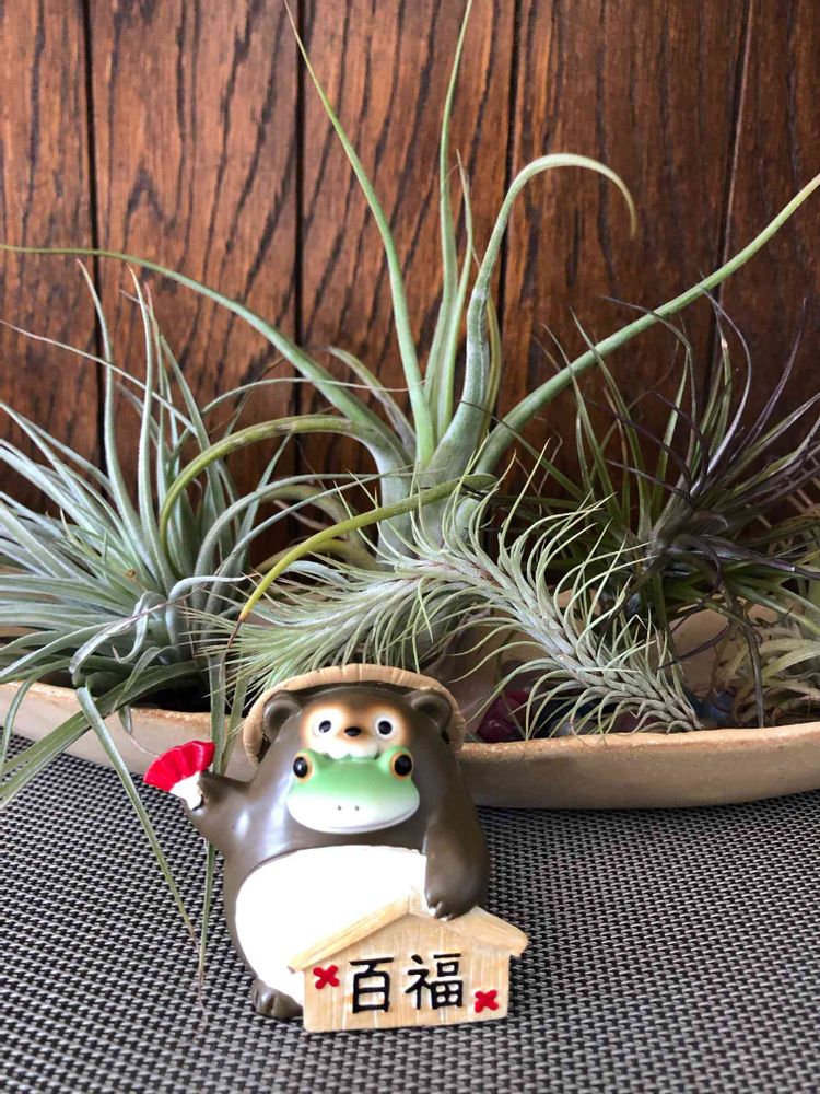 玄関には、リボン🎀をつけた女の娘タヌキと、オッサンタヌキがいます