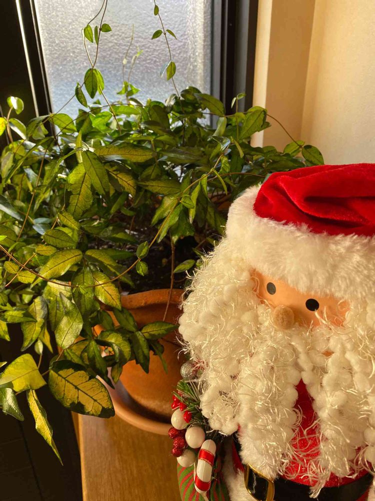 玄関の窓辺にオウゴンニシキ寒くなってもツヤツヤ サンタさんも嬉しそう