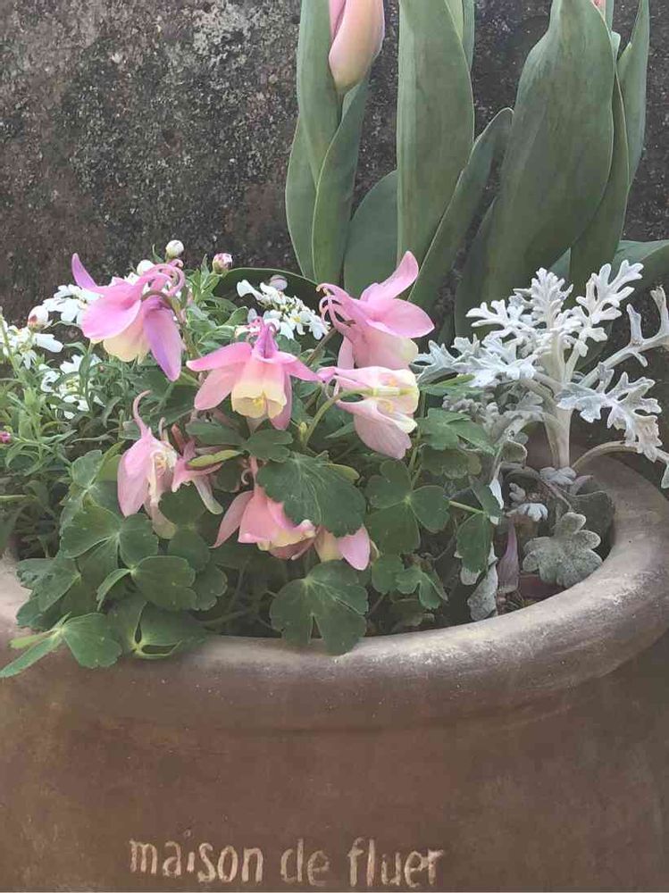 母が持ち帰った寄せ植えですが、優しいピンクのオダマキが可愛いですよね😍