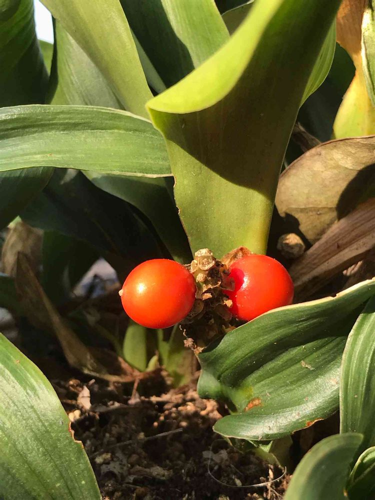 裏庭に放置プレイ中の万年青20鉢のうち、赤い実が全部で3個だけついていました😅