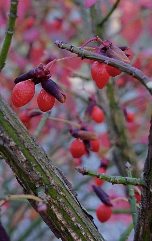 ニシキギ科ニシキギ属の落葉低木。野山の落葉樹林や林縁に生え、庭や生垣に植えられる。枝にコルク質の翼が矢羽のように張り出すのが特徴で、翼のない品種を『小真弓(コマユミ)』といい野生の個体に多い。葉は倒卵形で対生し鋸歯がある。花期は5~6月。葉腋に目立たない黄緑色の4弁花をつける。果期は10~12月。果実は蒴果。楕円形の果実は暗紫色に熟すと裂け、中から朱色の種子が現れて吊り下がる。種子の表面は仮種皮(かしゅひ💬種子の外側を被って種皮のように見えるもの。普通の種皮より柔らかく肉質)に覆われていて、鳥はこれを目当てについばみ種子を運ぶ。ツリバナと同じく、昔は果実をシラミ駆除に利用した。