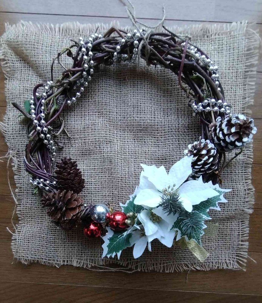 夕顔のツルでリ−ス作ってみました。家にあるクリスマスっぽい飾りもの付けてみました。
