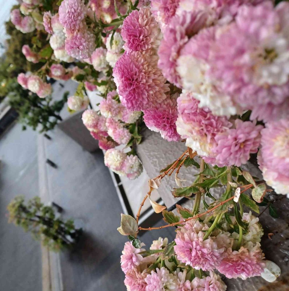 まん丸のピンポンマムさん黄色から優しいピンクに変わって素敵で楽しいですね〜