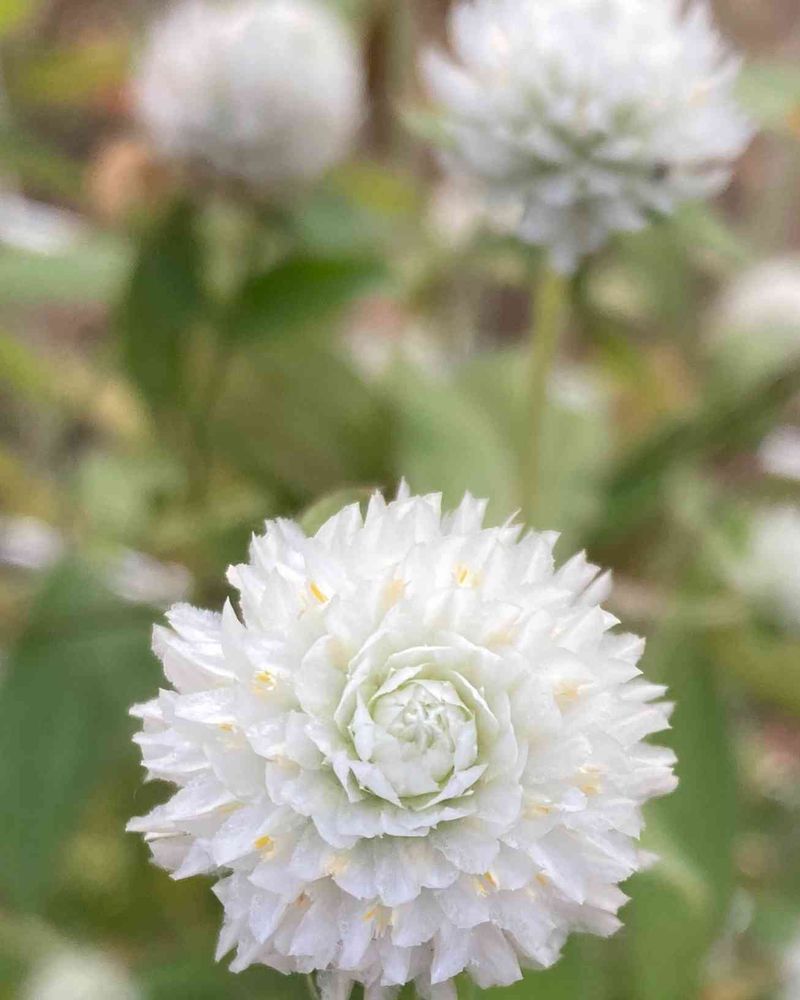 まだ咲いている千日紅。よく見ると苞がうずになっていて、小さな黄色い花はさすがに元気がない。
