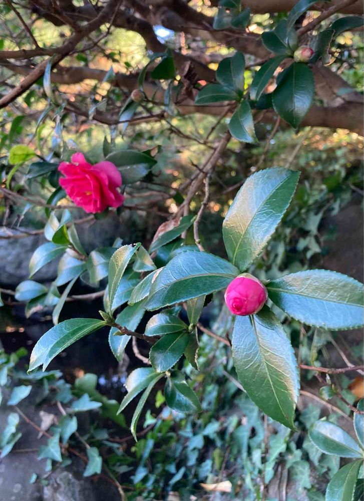 昨年は悩みました〜池の周りにあるので仕立てが小さいのですが…寒椿(椿と山茶花の交雑種)かなぁと🤔🙄