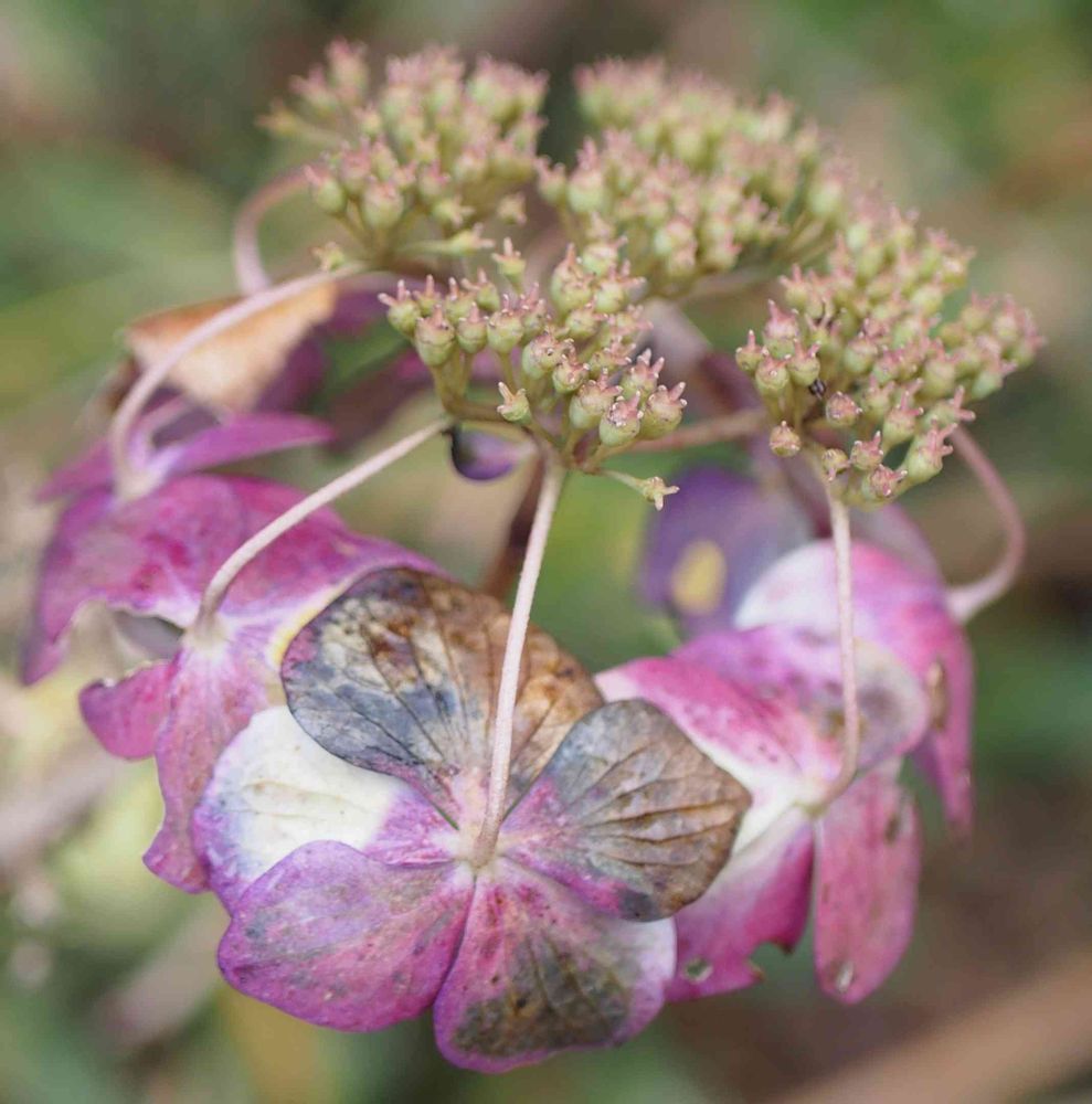 家の額紫陽花は、初めは上を向いていますがだんだん下を向きます。