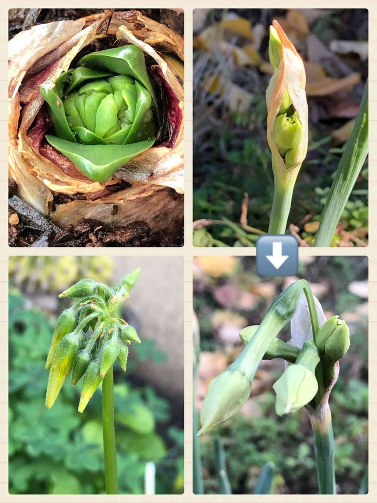 水仙の蕾が皮を破って出てくるのには驚きました😃