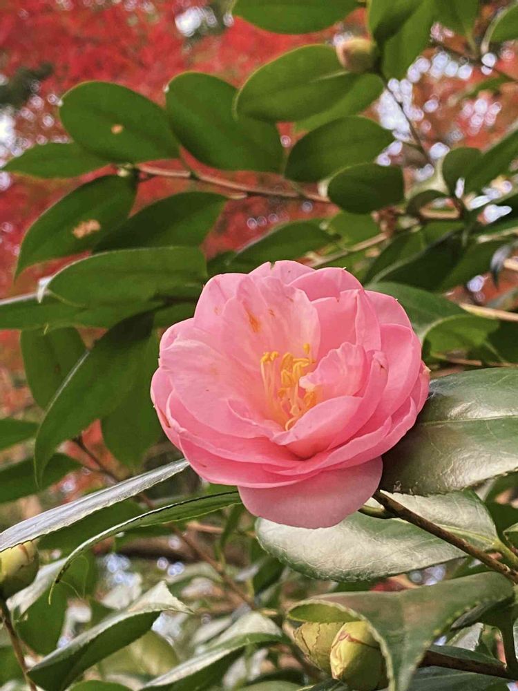 紅葉をバックに🍁サーモンピンクのツバキが、明るい日差しの中咲いていてステキな景色ですねえ✨🎶❣️