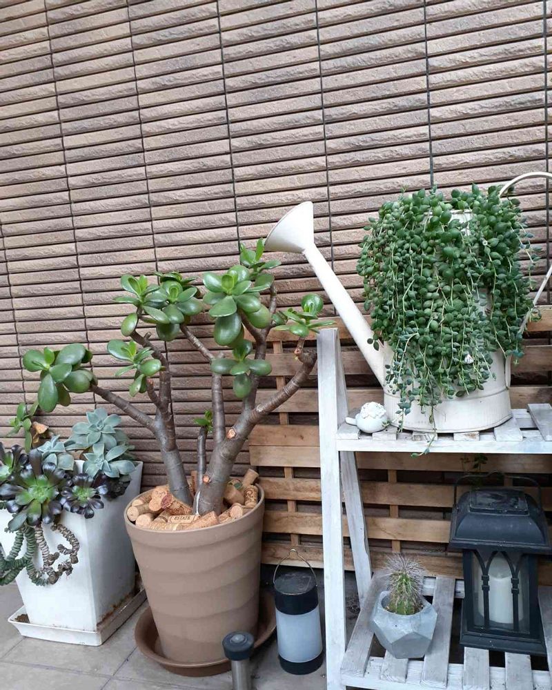 雨が、あたらない場所で育てている金の成る木、グリーンネックレスと多肉達です。
