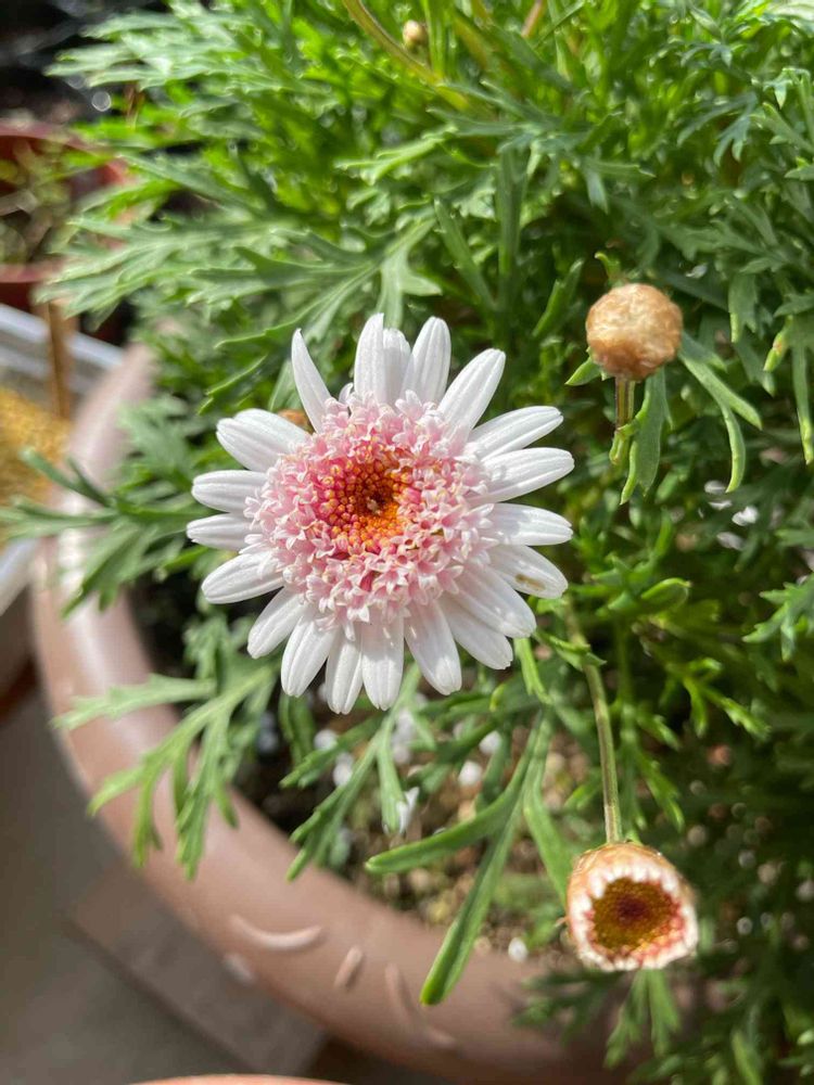 昨年株の挿し芽っ子ボンザマーガレットイチゴショート🍓可愛いピンク色になってきました🌸