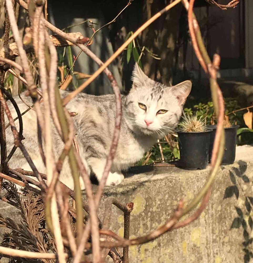 あけびのツルと塀の上で日向ぼっこする野良猫くん( ΦωΦ )