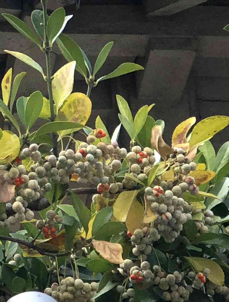 月に3〜4回前を通るお寺の、白壁からのぞいています。1ヶ月ほど前 白かった実が、今は弾けて可愛い赤が見えます…種でしょうか?