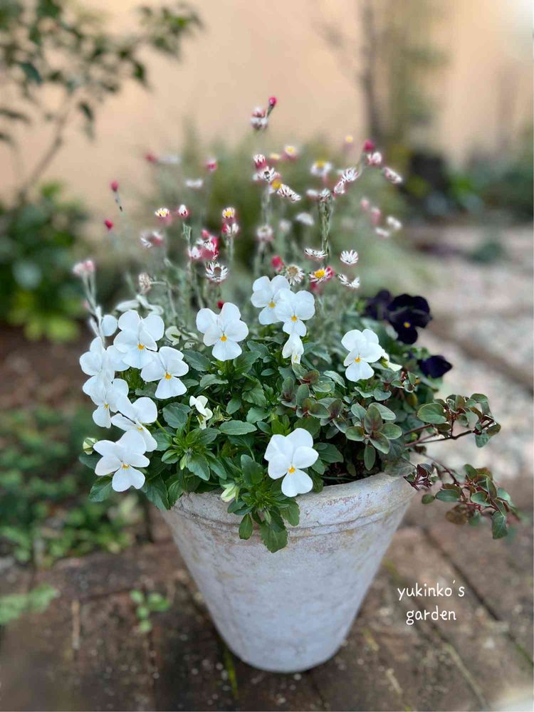 主張過ぎず、それでもちゃんと存在感があり白のビオラと黒いビオラをうまく引き立ててくれていますね🥰