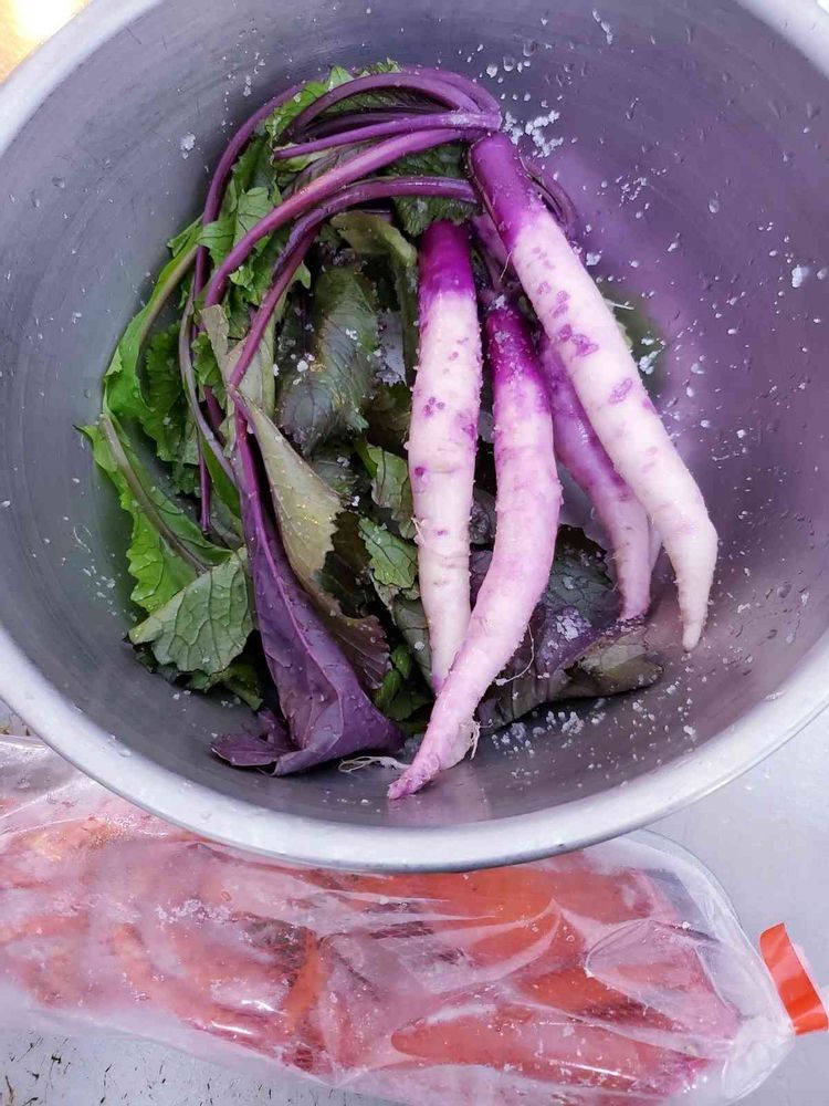 紫色の野菜を見つけると、塩をして半日置いて、ぬかに沈めます。