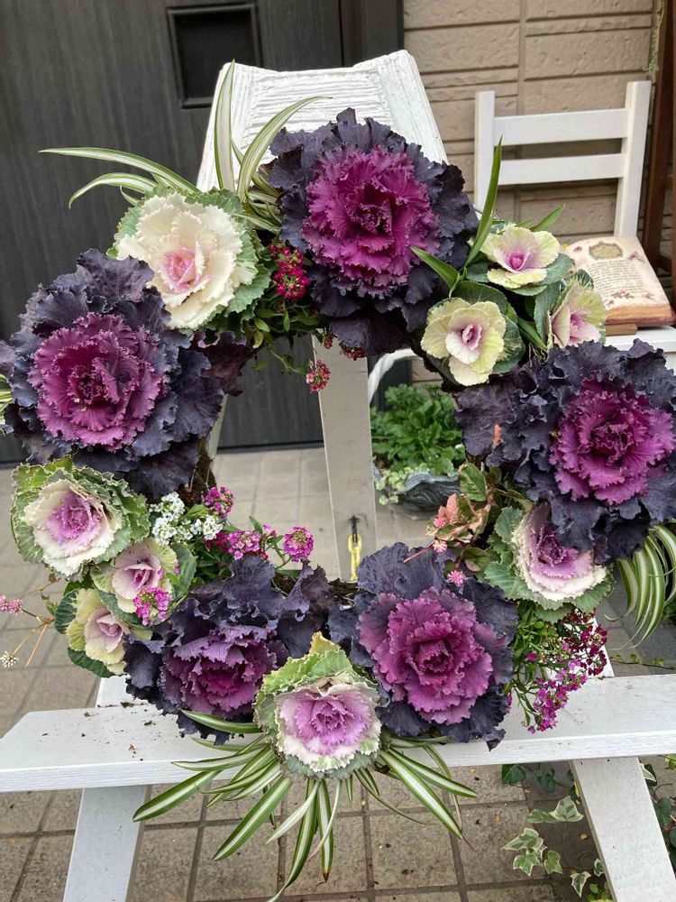 ハボタンのリース、華やかに仕上がりましたね🎵😃✨