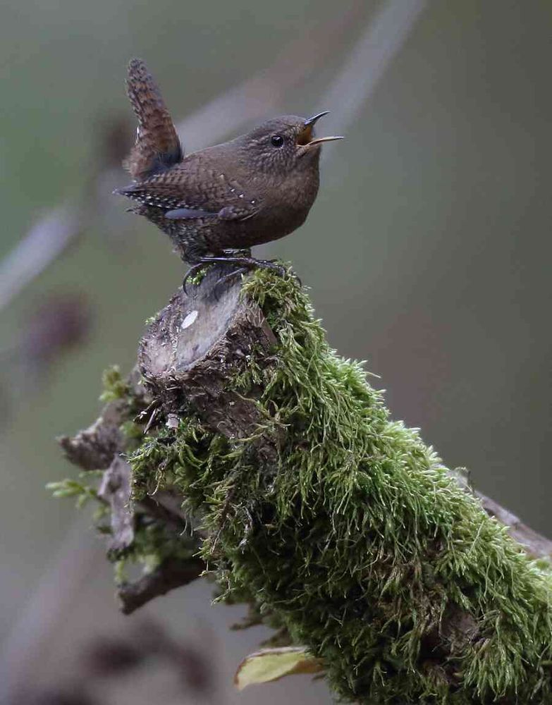 尾を立てて全身で囀っているのですね🎶お立ち台の苔も綺麗🤩