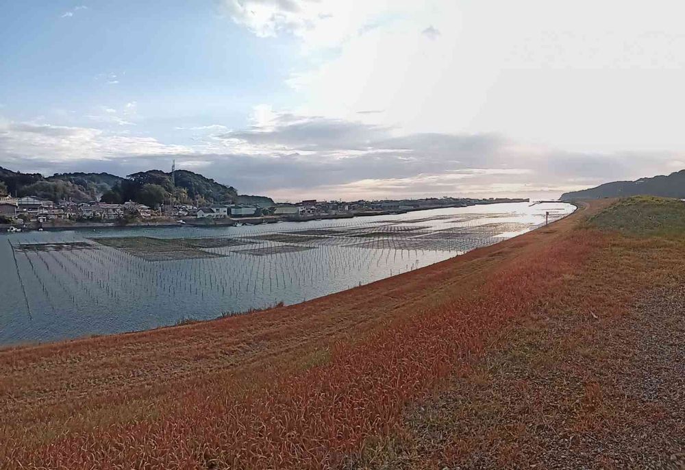 四万十川河口の支流の一つ 浅瀬にはアオサ海苔の網が水中に立てられた杭に結ばれ 其処だけが四角く色が変わっています。