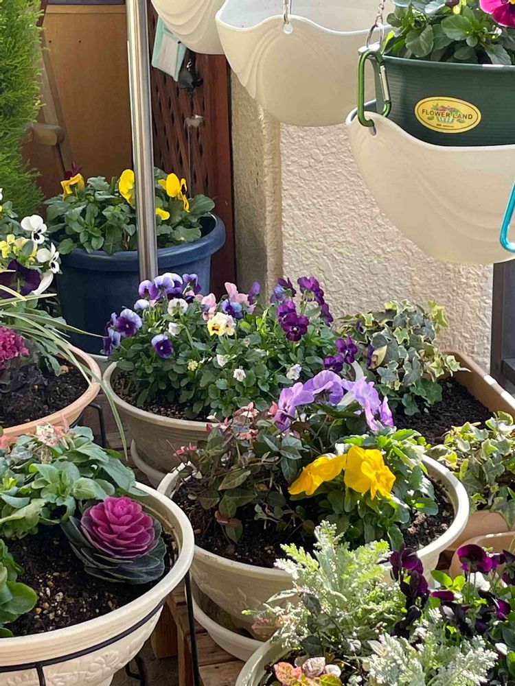 前からあったアイビーや初雪かずらのプランターにビオラやパンジー植えました。