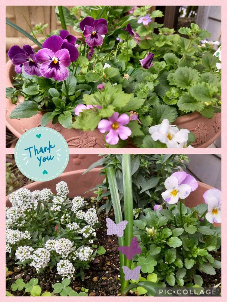 上のビオラは花が増えたけど、バコパ盛りはまだ花が少なめ。下のアリッサムは元気でいい香り♥️ビオラはまだ淑やかに。