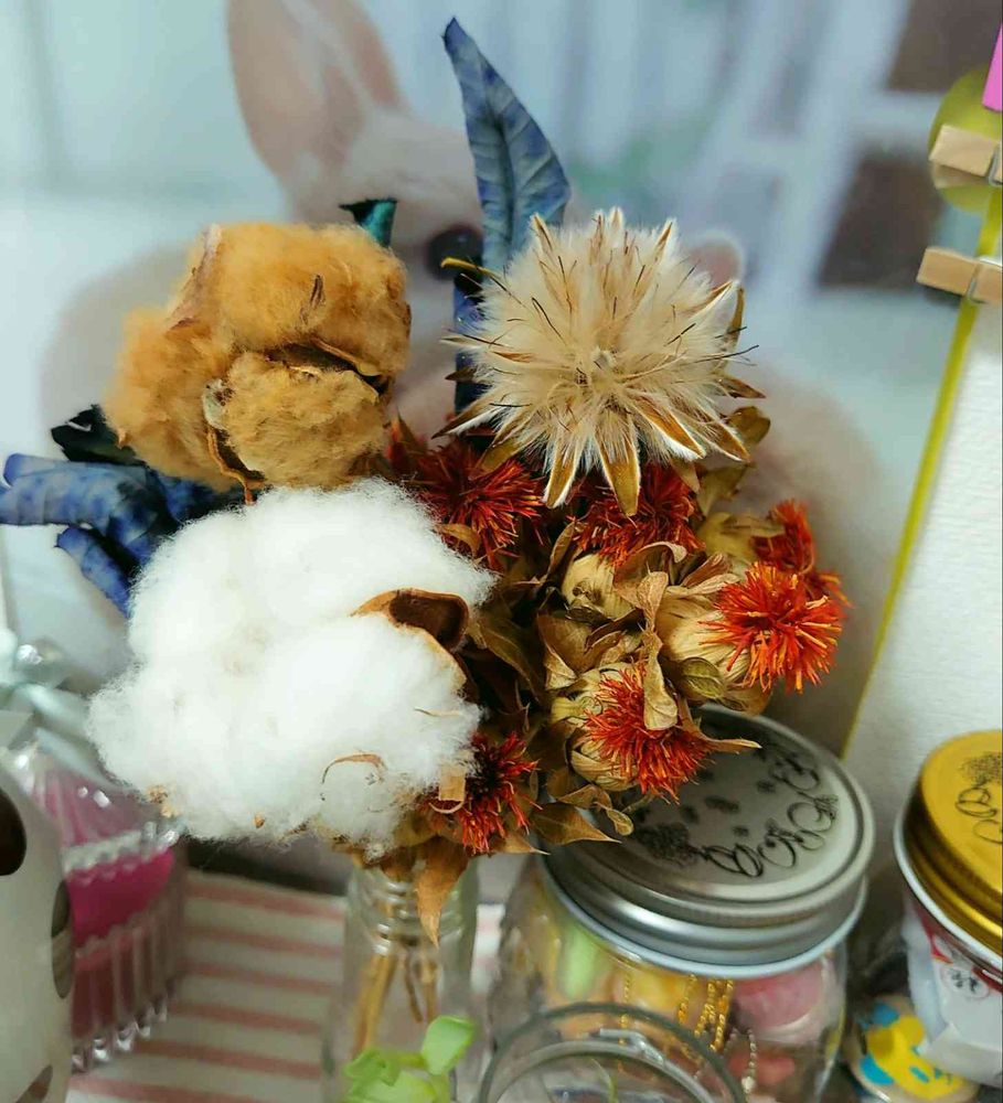捨てるのがもったいなくてとっておいた紅花に、コットンフラワーやプルモーサムを足してったらカオスです…