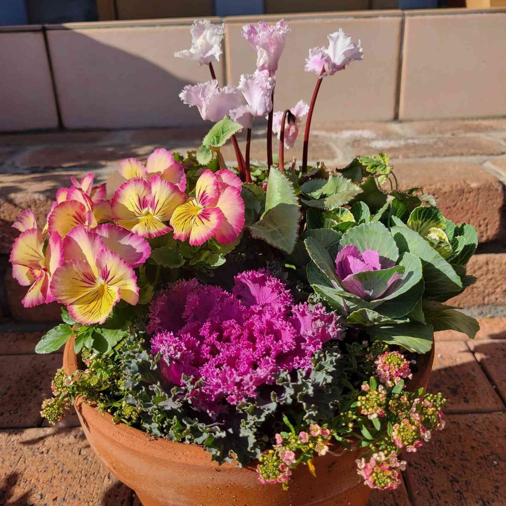 久しぶりに太陽燦々の玄関前でパチリ🤳葉牡丹の寄せ植え🍀農協で買った苗🌼