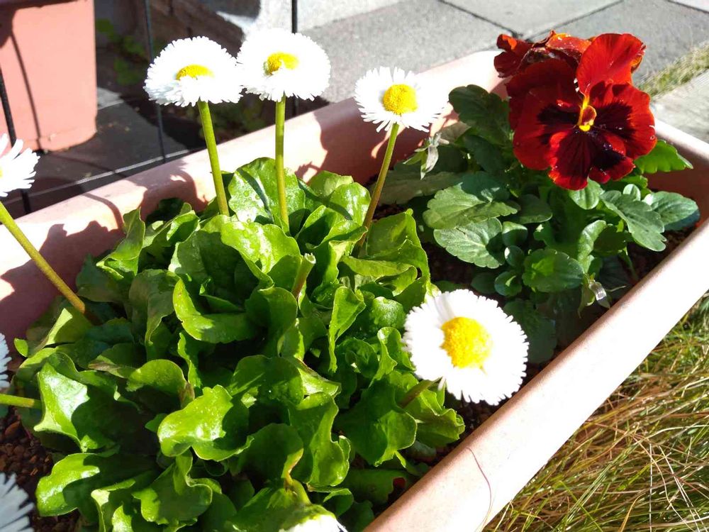 今日のお花デイジー、赤や白をパンジーと一緒に。