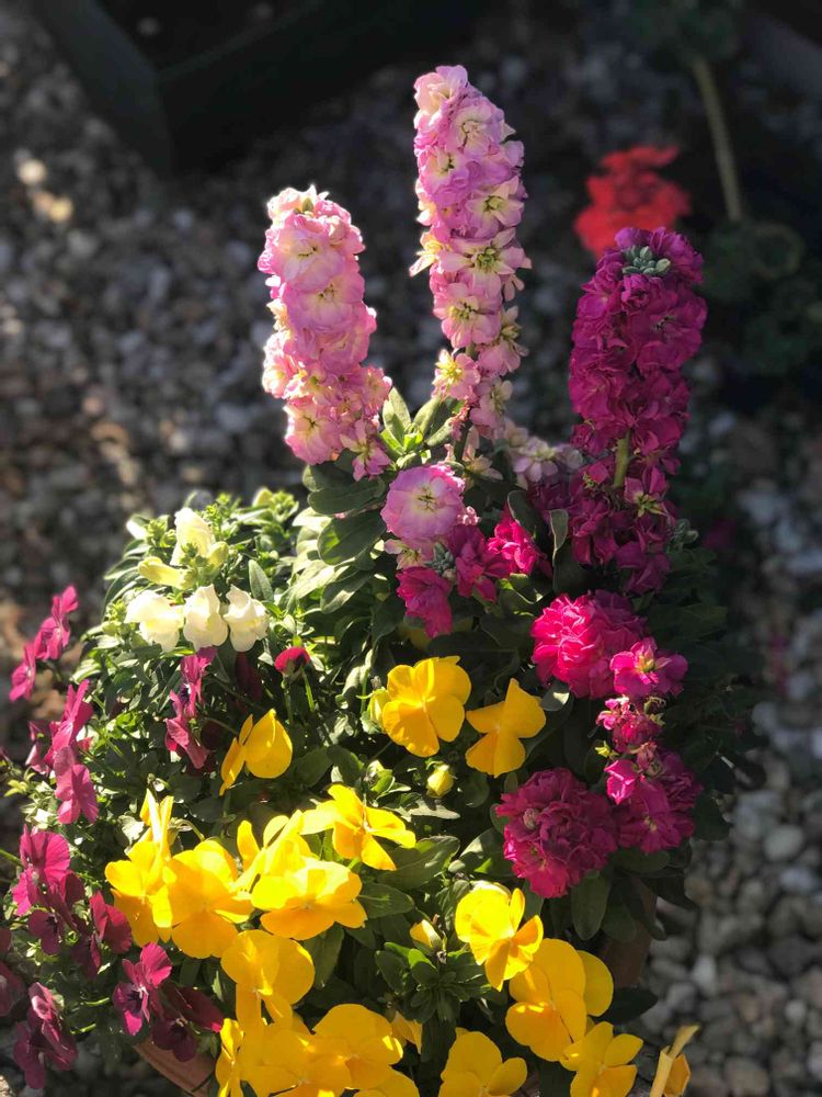 寒くても元気元気な寄せ植えの花たち
