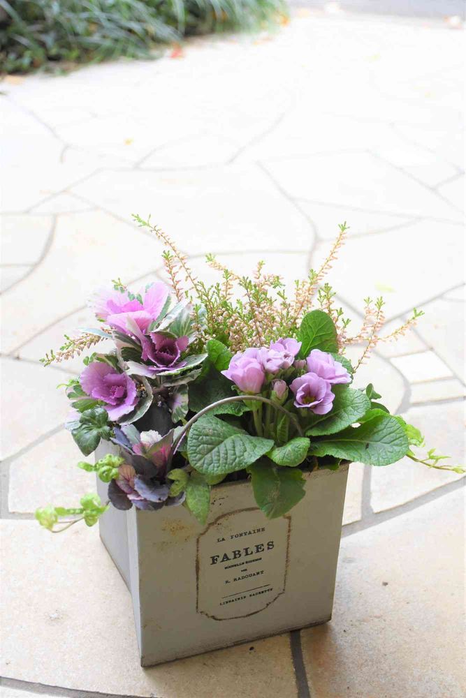 プリムラ ジュリアン、ハボタン、カルーナ、ヘデラ モコモコの寄せ植え