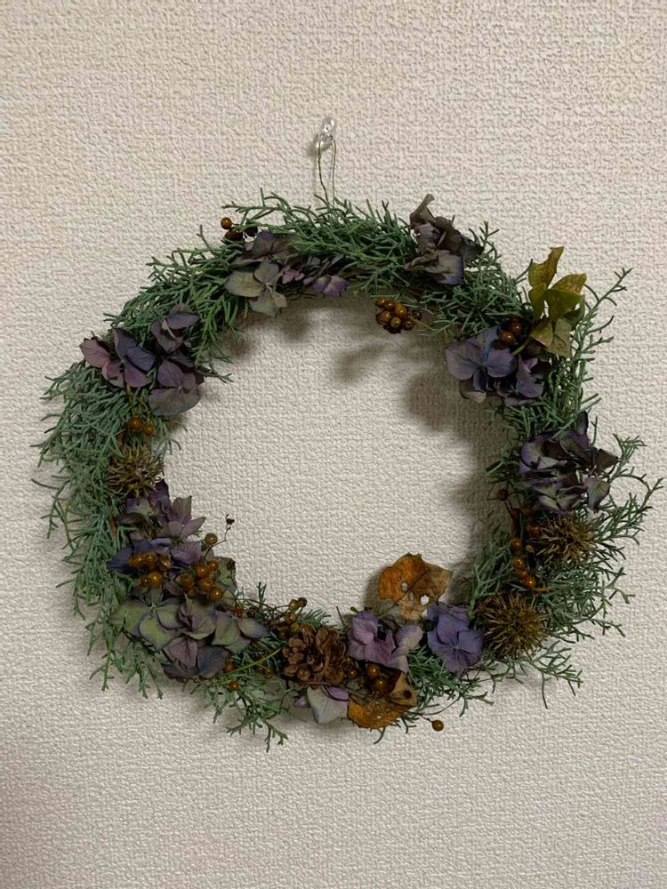 先日もらった、アイスブルーとアジサイを使ったリースが完成🥰