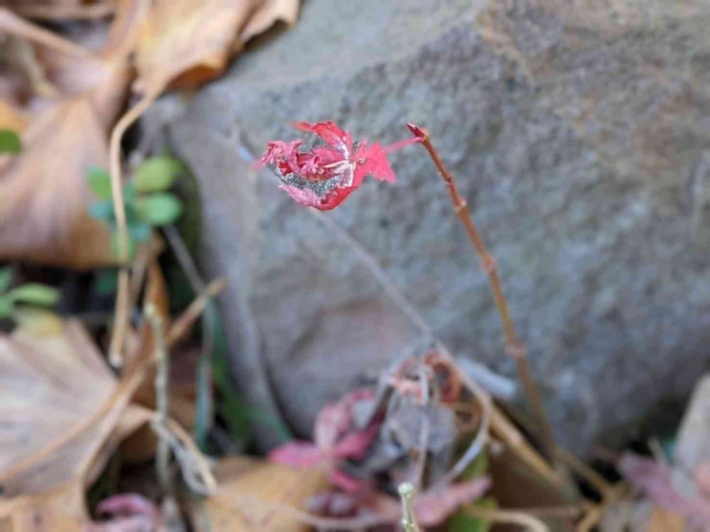昨日、庭の隅っこの石の際から小さな紅葉したモミジ…もう縮れていました。