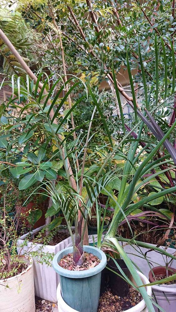 マダガスカルの熱帯雨林固有種。移植が難しい。水はけのよい砂質土壌を好む。過度な水やりはNG。10m近くまでに育つ。トライアングルパームの名の通り、葉が出る角度が3方向で幹が三角形の形になる。